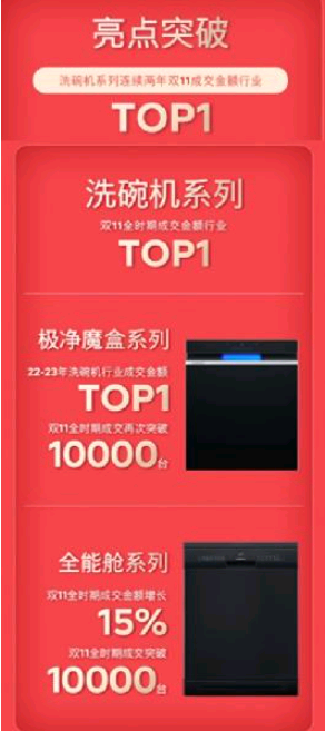 2023年以来,西门子家电打造了“西门子洗碗机节全民不洗碗”自有IP活动、“没洗事皆喜事”新婚场景专项营销、“免费橱柜安装”金牌服务推广项目、“洗碗交给西门子家电”双十一营销等系列动作,架起品牌与用户关系深化的通路,以用户听得懂、愿意听的方式沟通产品要点,制造情感共鸣的同时形成产品教育、深度种草的闭环。经过长期深入的教育与渗透,西门子洗碗机在2023年双十一再次脱颖而出,实现全时期成交金额行业TOP 1,连续两年位居双11成交金额行业排名榜首。