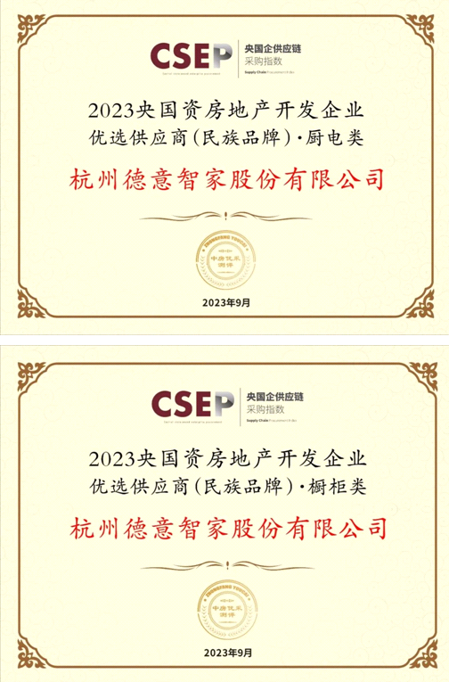 2023年10月,德意智家成功入围“2023央国资房地产开发企业优选供应商(民族品牌)·厨电类”和“2023央国资房地产开发企业优选供应商(民族品牌)·橱柜类”榜单。