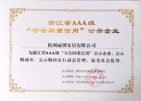 2023年9月,丽博家居再获浙江省AAA级“守合同重信用”企业荣誉称号。