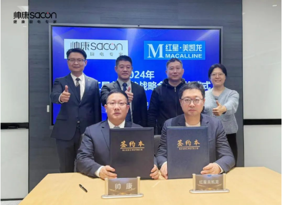 2024年1月11日,帅康电气常务副总裁庞廷杰与红星美凯龙智能电器总经理许晶在上海签订2024年战略合作协议,双方将在门店拓展、品牌传播、联合营销、以旧换新、设计师运营等方面展开深度合作,共同推动厨电行业的创新发展。