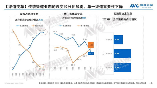 2023年双11节点的渠道竞争状态,展现了整个行业目前渠道端竞争特点,我们看到除了传统电商之外,抖音、快手、拼多多、小红书等渠道都纷纷发光发热,对于经营厨房小家电的品牌来说,每一个渠道的布局都显得尤为重要,在存量市场之中失去份额的风险越来越大。此外,从目前渠道变化趋势上来看,线上的新兴电商渠道和线下的百货渠道等成为消费者转移的方向。