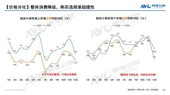 整体行业需求呈现K型分化,高端占比增速放缓,中高端向中低端转移加重,促使行业呈现较明显的消费降级,据奥维云网(AVC)推总均价显示厨房小家电2023年均价207元,同比下降8.0%。
