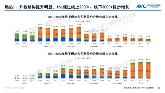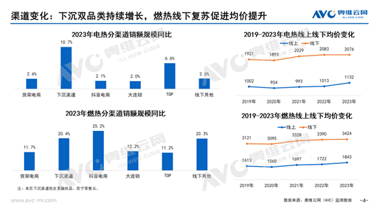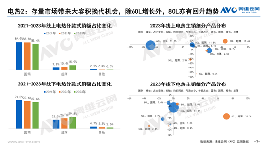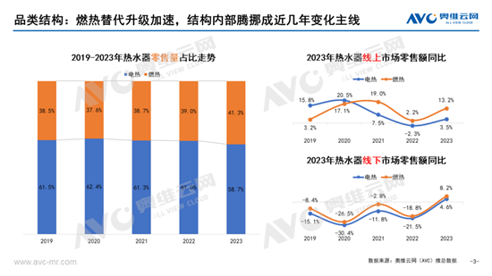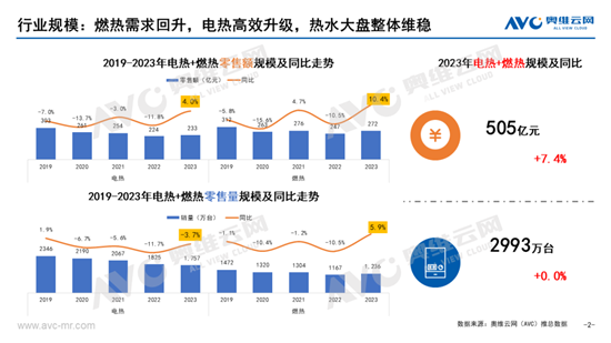 由于热水器重安装和强服务属性,更多抑制的需求在2023年释放,整体规模实现显著增长。据奥维云网(AVC)推总数据,2023年电热零售额233亿元,同比增长4.0%,燃热272亿元,同比增长10.4%;电热零售量1757万台,同比下降3.7%,燃热1236万台,同比增长5.9%。