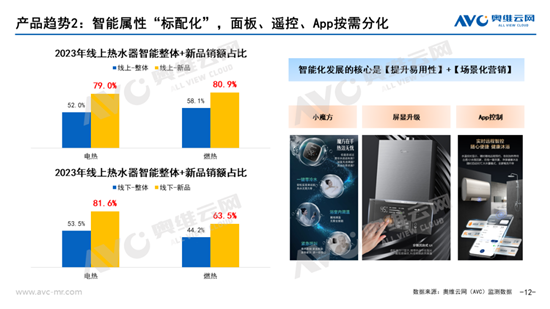 产品的智能化已几乎发展成为热水器产品的标配,据奥维云网(AVC)监测数据,电热和燃热线上线下新品的智能销额占比均超过60%。从消费者体验来看,智能发展的核心是易用性的提升,例如遥控方式和操作面板的优化;例如App控制对于上班族有很强的适用性,场景化营销也必不可少。