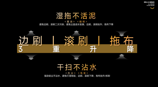 “三重升降系统”的应用,真正实现了“干扫不沾水,湿拖不和泥”。扫地机器人在边刷、滚刷下降扫地时,“三重升降系统”可以抬升或拆卸拖布,避免吸扫的灰尘杂物沾水,也避免湿拖布打湿地毯。当扫地机器人拖布下降拖地时,“三重升降系统”能够抬升边刷、滚刷,不但可以避免边刷、滚刷二次污染,还能避免尘盒进水导致发臭。
