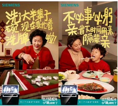 此次营销在场景构建方面深入人心。创意视频巧妙地以洗碗机为主视角,观察家庭成员“大扫除”“拜新年”的忙碌情景,通过定格忙碌时刻还原浓厚的春节场景氛围。随着剧情层层推演,西门子全能舱Auto洗碗机欢“洗”登场,忙着让家庭解放双手、轻松享受团聚时刻,成功凸显了西门子洗碗机的陪伴角色。不仅用多重创意叙述直击消费者新春洗碗的痛点,西门子洗碗机还以生动形象的海报创意加深对节日的“忙”的重新定义,“洗了大半辈子碗,现在要忙着洗牌啦”“不必事必躬亲,省下时间用来隔辈亲”系列素材契合了当下消费者们松弛、乐活的生活态度和群体意识,对传统过节方式的破局、重塑,让西门子洗碗机与用户达成强烈的情感共振。