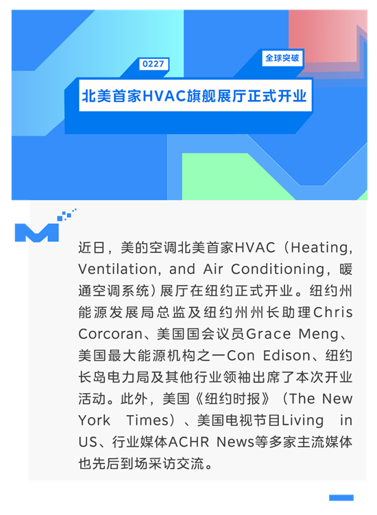 HVAC专业媒体ACHR News的主编Kyle Gargaro认为,美的一直深度参与纽约市场,持续推出高能效的热泵产品。这次HVAC展厅的开业,为暖通空调行业的专业人员和消费者提供了可以亲身体验最新清洁制热技术的独特机会。