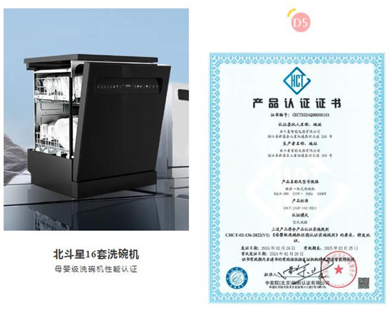 该认证是目前行业内母婴级洗碗机的权威认证,从根本上实现了母婴概念产品的考核评价体系。北斗星洗碗机D5在中家院(北京)检测认证有限公司(中国家用电器检测所)健康家电检测中心,依据CHCT-JSGF-142-2022《母婴级洗碗机性能评价技术规范》进行了母婴洗净指数、母婴干燥指数、漂洗率、除菌率、除病毒率、噪声项目的检测并符合CHCT-02-136-2022(V1)《母婴级洗碗机性能认证实施规则》中的规定,取得产品认证证书。
