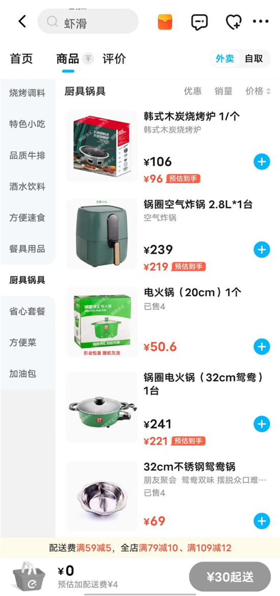 其外卖页面也销售与食材配套的相关锅具、小家电产品,鸳鸯锅、电火锅、木炭、烤炉、空气炸锅等等,涵盖其产品所需的所有烹饪方式。并且几乎都为其自有品牌产品,如果有品牌家电企业试图切入,那也只有代工。