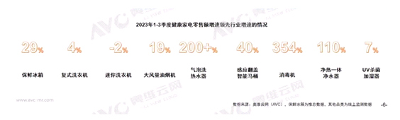 奥维云网(AVC)数据显示,2023年前三季度保鲜冰箱全渠道零售额同比增长29%;大风量油烟机、气泡洗热水器、消毒机、净热一体净水器等品类在线上市场的零售额分别同比增长19%、200%+、354%、110%。