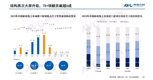 今年双11.大尺寸电视毫无意外地再创新高,据奥维云网最新披露数据,双11大促期间,中国彩电市场零售额规模为158亿元,同比增长8.2%,其中75英寸及以上机型贡献了超6成的销售额。此外,在2023年第三季度中,75英寸及以上机型的零售量均有所增长,其中75英寸、85英寸更是成为主销尺寸。