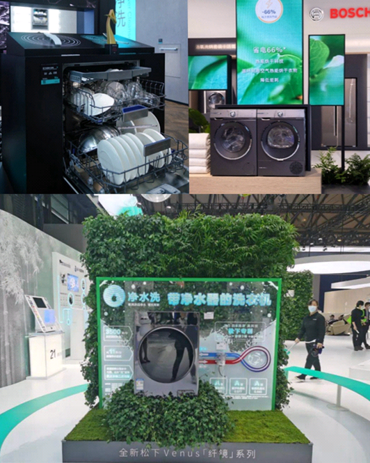 不仅如此,在节水方面,AWE2023同样让人们看到了最具绿色力量的前沿科技产品。如,西门子全能舱pro洗碗机,其搭载的Aqua Sensor油污智感系统,可利用光感检测水体污浊度,进而判断餐具的脏污程度,使用水量更精确,高效节省洗涤过程用水量。松下离心净水洗洗衣机在洗衣同时,可通过离心泵分离污水,排出残留毛屑,实现对水的循环使用。博世洗衣机在i-DOS自动投放科技支持下,可智能计算洗涤液用量,从而减少漂洗耗水,相较于传统机型可节省18%用水量。