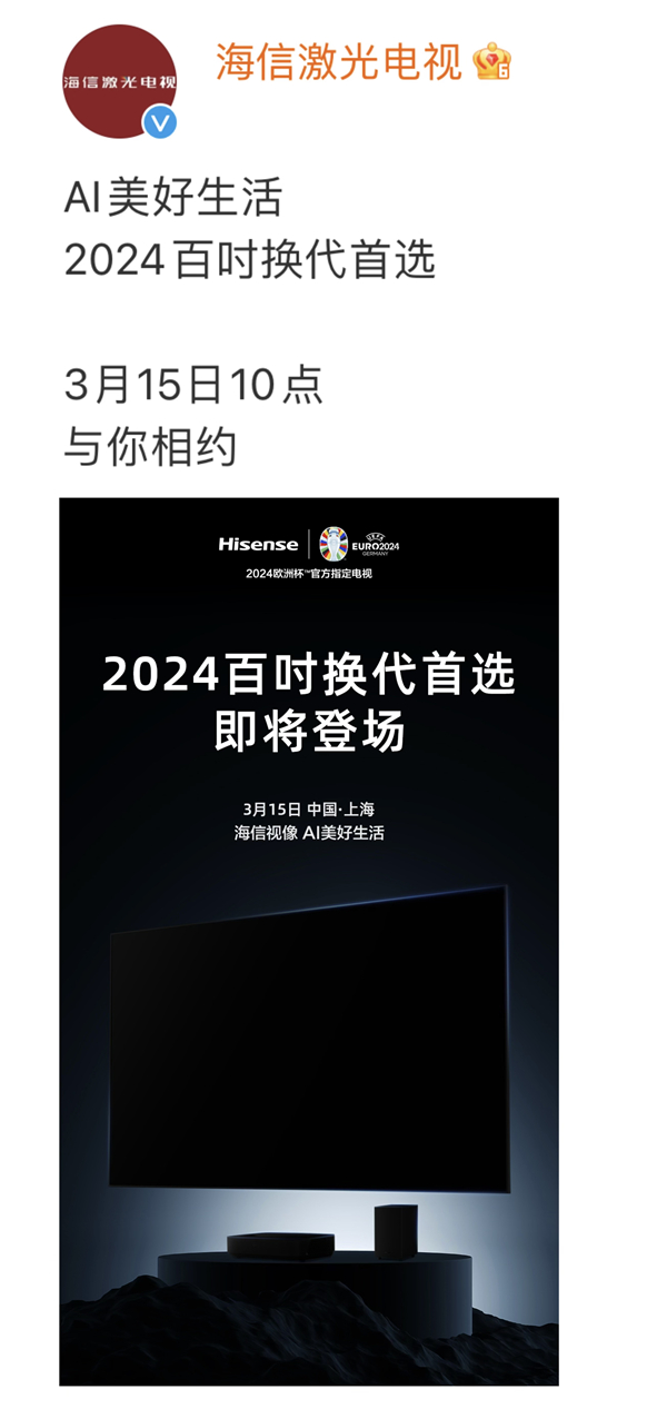 作为全球电视领导品牌,海信怎会缺席这场AI狂欢?从海信激光官方微博释放的信息来看,3月15日,海信激光电视将举行新品发布会,或并将围绕AI+电视的组合大做文章。另有消息透露,海信将在AWE期间发布全新一代百吋激光电视产品“星光S1”,这不禁让人遐想,星光S1是否就是“AI+百吋激光电视”的“王炸组合”?如果这一猜想成真,身兼大屏护眼优势与AI技术双重属性的星光S1,或将成为人们迈入百吋电视时代的“换代首选”。