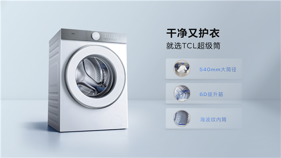 TCL超级筒洗衣机的行业第一的洗净比是如何达成的?答案是TCL行业首创的超级筒科技:540mm行业最大筒径、6D提升筋和海波纹内筒。