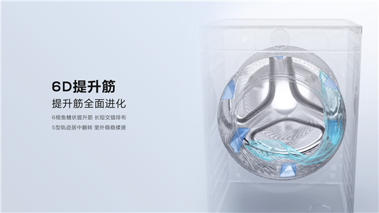 不止拥有行业最大直径内筒,TCL超级筒洗衣机的内筒细节设计的“含金量”也远超以往。提升筋是洗衣机内筒上的长条状突起,一般为3根三角形、半圆形或梯形结构,能够带动衣物翻转,使衣物在滚动过程中增加摩擦,衣物进行前后翻转,实现摔打。而TCL超级筒洗衣机的内筒采用6D提升筋,其6根鱼鳍状提升筋数量是一般洗衣的二倍,一长一短交错排布,就像人的左右手,交错运动,实现揉搓。提升筋上还有特殊条纹,实现衣物S型翻转,前后左右都能揉搓到,较普通洗衣机翻转次数增加1倍,运动轨迹延长80%,洗得更干净,以往隐藏在领口、腋下、袖口、内衣内裤局部等部分的顽固污渍不再不可战胜。