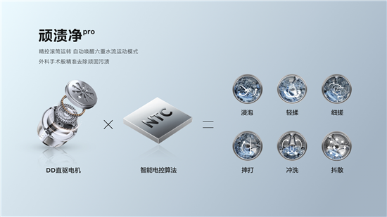 顽渍净pro采用48组磁极的DD直驱电机,精准控制洗衣机滚筒,实现对水流的精准控制,实现“六重水流运动模式”,提供“浸泡、轻揉、细搓、摔打、冲洗、抖散”六种不同的洗涤模块,通过电控算法和洗涤模块的组合,控制水温、流速、转向,洗涤方式量身定制,实现外科手术级别的顽渍清除。