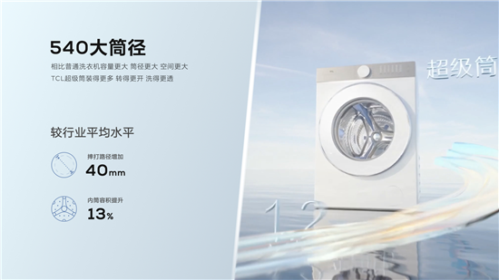 首先,TCL超级筒洗衣机将内筒筒径增大至行业最大的540mm。滚筒洗衣机主要通过摔打衣服模拟手洗效果:衣服提升至一定高度,由于重力作用重新跌回洗衣液中,相互撞击产生摔打作用,从而达到洗涤效果。相对行业500mm的平均筒径,TCL超级筒洗衣机摔打路径增加40mm,每一次摔跌、撞击的力度更加充分,使污渍与衣服纤维彻底分离,实现更优秀的清洗效果。此外,由于筒径更大,不但容纳的衣服更多,还能轻松应对床单、被罩、窗帘和厚重外套等大件衣物。