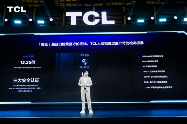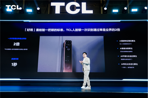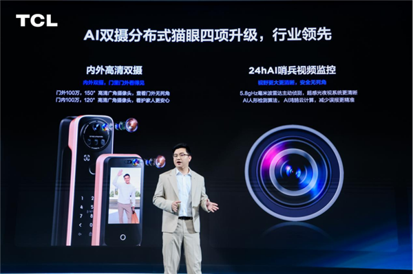在智能锁的音像交互模组上,TCL凭借出色的专业屏显能力,成为大屏猫眼智能锁的领军品牌,根据奥维云网(AVC)数据显示,TCL大屏猫眼智能锁连续2年销量第一。但这还远远不够,为了给到用户更好的体验,本次也是进行了双4.5英寸高清大屏、内外高清双摄、分布式多屏联动和AI哨兵视频监控四项升级,让你无论身处何地,都可以将门内外情况尽收眼底,超大屏,安全无死角,实现了行业遥遥领先。