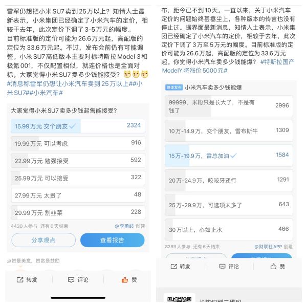 而我本人则参与了价格调查,在一个自媒体平台上发出的投票,主题是,大家觉得小米SU7卖多少钱起售能够接受?