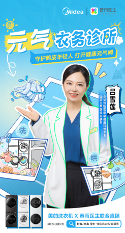 3月24日,美的洗衣机与春雨医生特邀嘉宾,中华预防医学会健康科普专家、北京三甲医院皮肤科主任吕雪莲,一同出现在抖音和京东直播间。吕医生拥有30年皮肤科临床诊疗经验,强调皮肤病“在于治更在于防“。此次针对脆皮年轻人常见的皮肤问题,她从衣物洗护方面给出建议,通过互动直播,展示了美的元气系列纯平全嵌洗烘套装(下文简称:美的元气洗烘套装)医护级除菌洗烘效果。