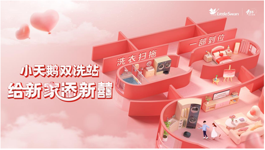 小天鹅洞悉现代新婚年轻人,不喜欢做家务、渴望轻松自由的婚后生活,然而经常要面对洗衣、扫地、拖地等繁琐的家务难题,为了提升新人生活幸福感,给家务减负,小天鹅创新推出双洗站,创造性将洗衣机、扫地机、洗地机相融合,重构产品新形态,实现“一机顶三机”,做到“洗衣扫拖,一部到位”,让新婚家庭用户只需花一半的价格,就能获得三倍的快乐。
