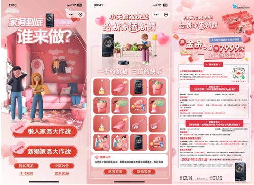 为了提升新婚目标用户参与度,扩大流量,结合家务痛点以及产品功能,小天鹅双洗站还上线“家务消消消”小程序,通过家务消除活动小程序玩法,创新裂变式的互动分享机制,让更多用户参与游戏体验,病毒式游戏“囍”卷全网。