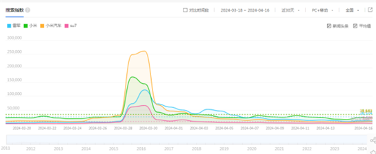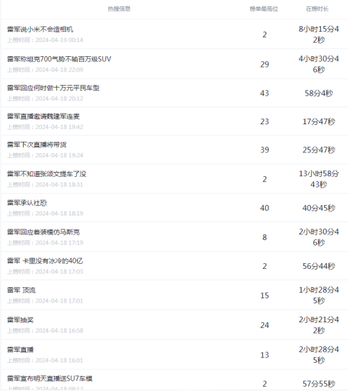 根据专业统计网站显示,仅仅4月18日,即华为手机新系列PURA发售当天,雷军就有13个话题陆续登上微博热搜榜。
