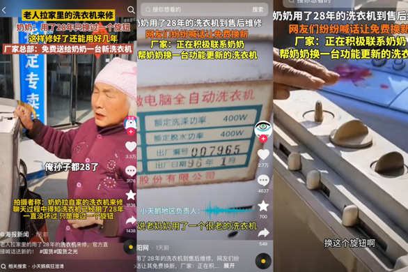 老奶奶拉28年洗衣机找售后维修,品牌火速上门换新。这一幕就发生在近日!据悉,这位老奶奶作为小天鹅的忠实用户,一直舍不得更换家中那台陪伴了她28年的洗衣机。近期,她发现洗衣机的旋钮有些老化,便决定将其送到维修点进行简单维修,洗衣机又重新回到了“工作岗位”。这一幕刚好被网友分享到网上,28年的相互相陪伴引发了全网的围观。