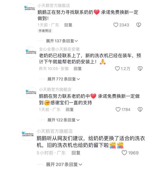 小天鹅官方在得知这一消息后,被老用户的“深情”深深打动。他们迅速行动起来,通过全网寻找这位老奶奶,并在4月17日晚上成功与她取得联系,免费为老奶奶更换一台全新的洗衣机。