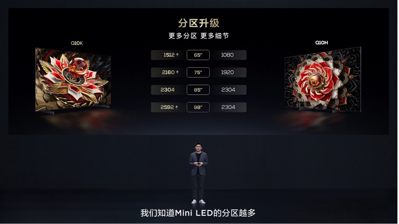 其中65吋从1080分区提升到1512分区,75吋从1920分区提升到2160分区、98吋从2304分区提升到2592分区。这次升级使各尺寸的分区更加均衡,而且Q10K所有尺寸的分区数量,也全面领先同价位产品。