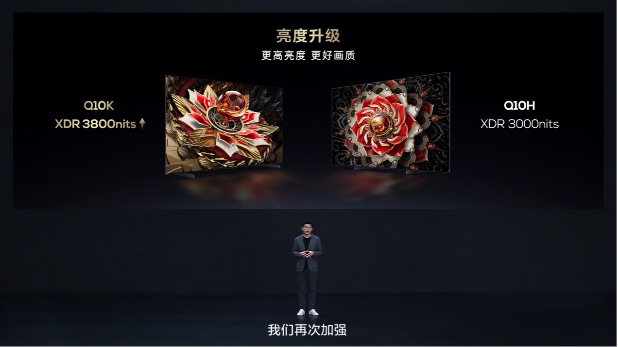 在亮度方面,Q10K的升级更加明显。原本上一代产品Q10H的XDR 3000nits亮度,已经远超只有2000nits的同价位段行业平均水平,而本次Q10K再次扩大领先优势,98/85/75三个尺寸亮度均提升至XDR 3800nits,65英寸电视的亮度也提升至XDR 3500nits,同时,Q10H的动态对比度高达3800万比1.层次更分明,细节更清晰。