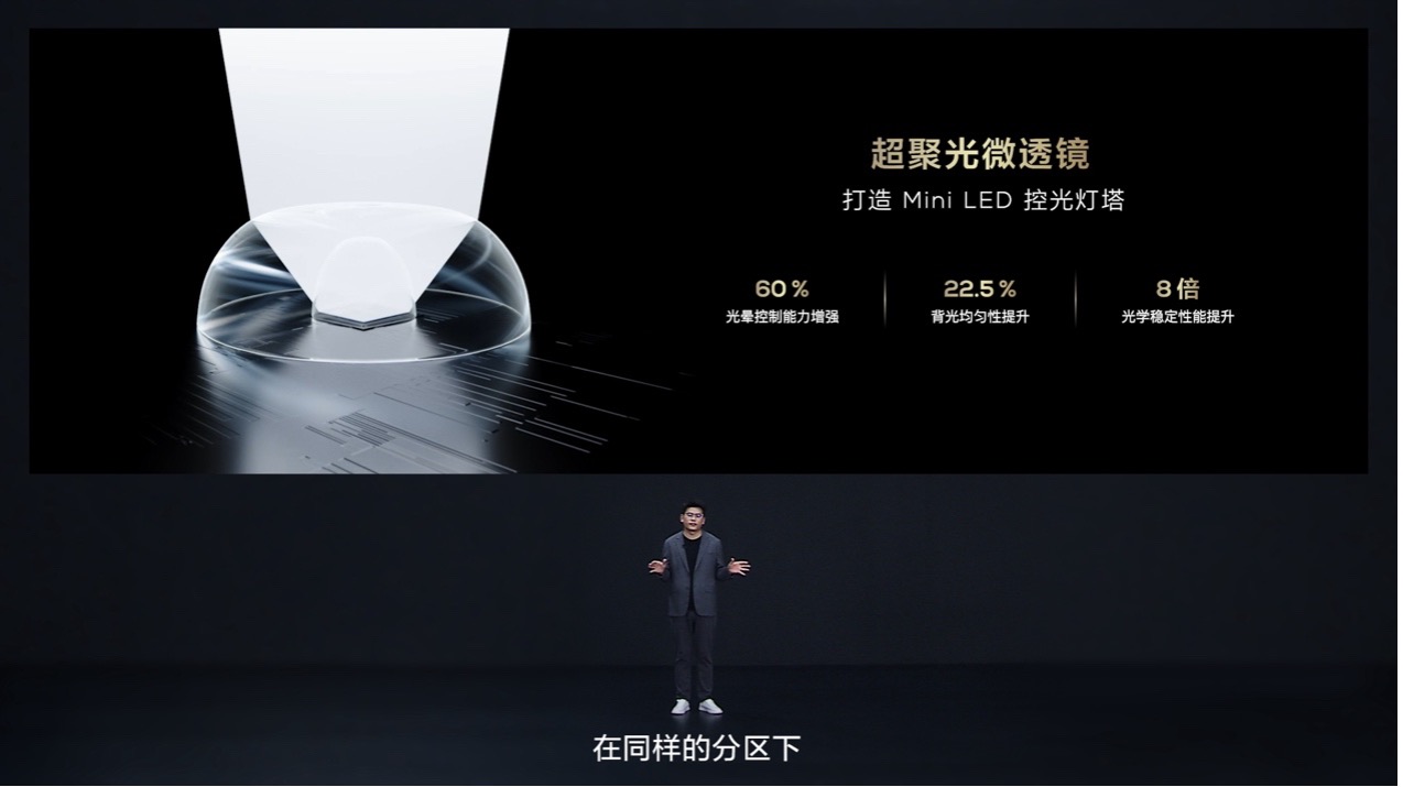此外,Q10K的透镜还从上一代的光学影像微透镜升级成了超聚光微透镜,让透镜的聚光能力更强,光晕控制能力也更好。相比普通Mini LED电视的透镜,TCL超聚光微透镜可以实现22.5%背光均匀性提升,60%光晕控制能力提升,以及8倍光学稳定性提升,并且拥有24项透镜专利,透镜技术断档领先。