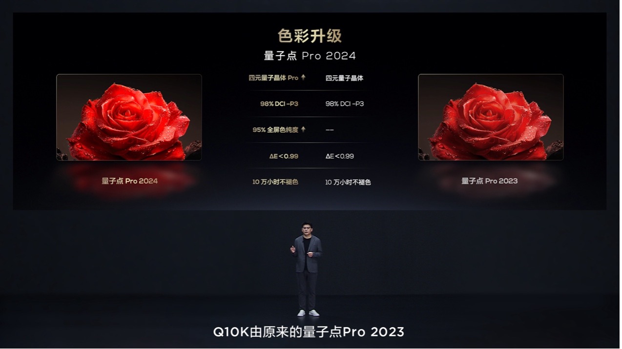 在色彩方面,基于最新的量子点Pro 2024显示技术的升级,TCL Q10K不仅晶体结构更稳定,色彩寿命更长,而且能够实现在DCI-P3标准下的98%色域值,95%的超高全屏色纯度,色彩表现也更为均匀艳丽,这也是Q10K实现典藏级影响的重要因素。