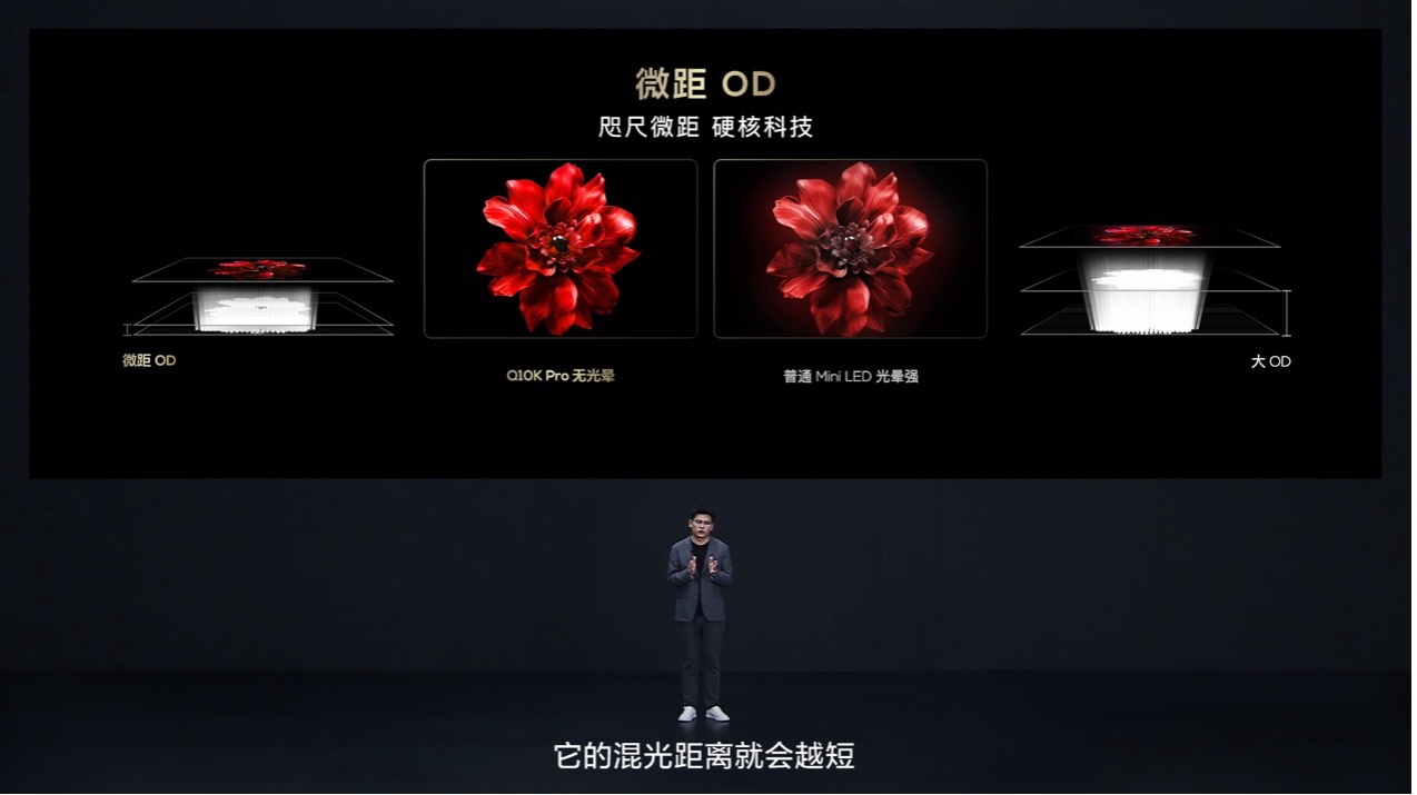 微距OD的实现,是TCL在光晕控制方面的另一个独门秘技。OD是指背光灯板到扩散板之间的距离,OD 值越小,发光面越聚焦,与规划分区大小越匹配,光晕控制能力越强,微距OD让Q10K控制光晕游刃有余。