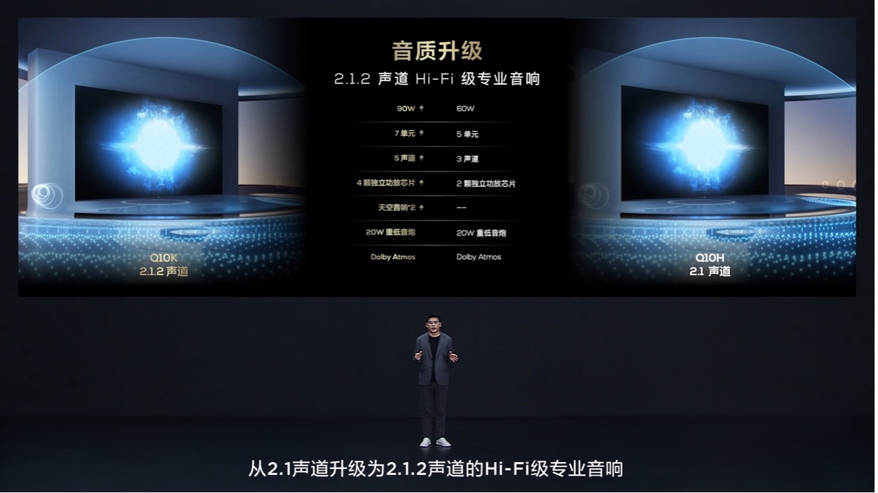 在音质方面,Q10K Pro同样搭载了2.1.2声道的Hi-Fi级专业音响,支持Dolby Atmos全景声音效。同时也采用了旗舰感满满的超薄一体化贴墙外观,并使用了美感十足的Mini LED星空纹理和引力星环重低音等设计。