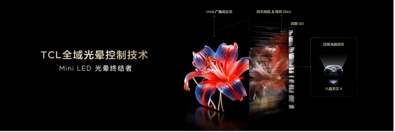而在光晕控制方面,TCL的全域光晕控制技术堪称行业最领先的技术方案,其由六晶方芯Ⅱ、超聚光微透镜、瞬态响应、双向16bit、微距OD以及HVA广角低反屏六个部分组成,能在Mini LED成像的全链路上实现精准调控,为画质进阶打下基础,被业界誉为“Mini LED光晕终结者”。