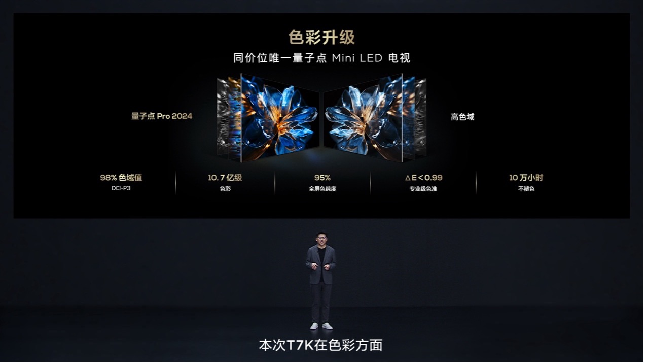 在画质方面,T7K采用了定制光学影像微透镜,瞬态响应,双向16bit等Mini LED核心画质技术,可以大幅减少光晕的产生。同时T7K是同价位段唯一一款既具有Mini LED+量子点显示技术的高画质产品,色彩更丰富,色准更高,而且色彩显示更持久。