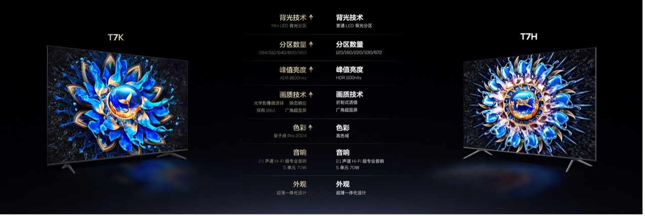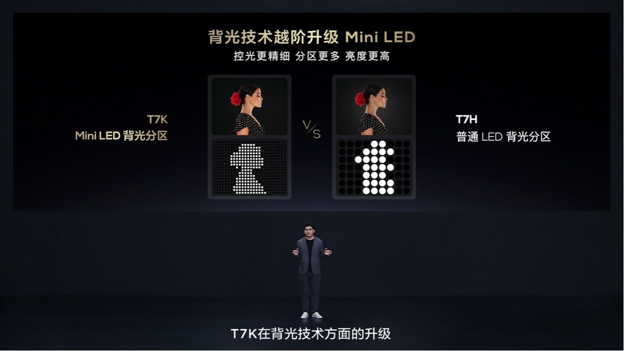 相比于T7H,T7K实现了从传统LED电视越阶成Mini LED电视,并在五大方面得到升级。