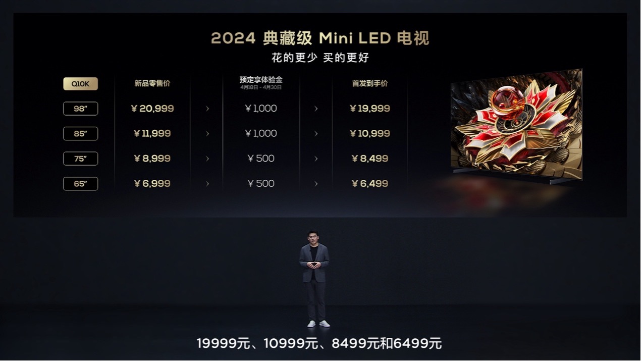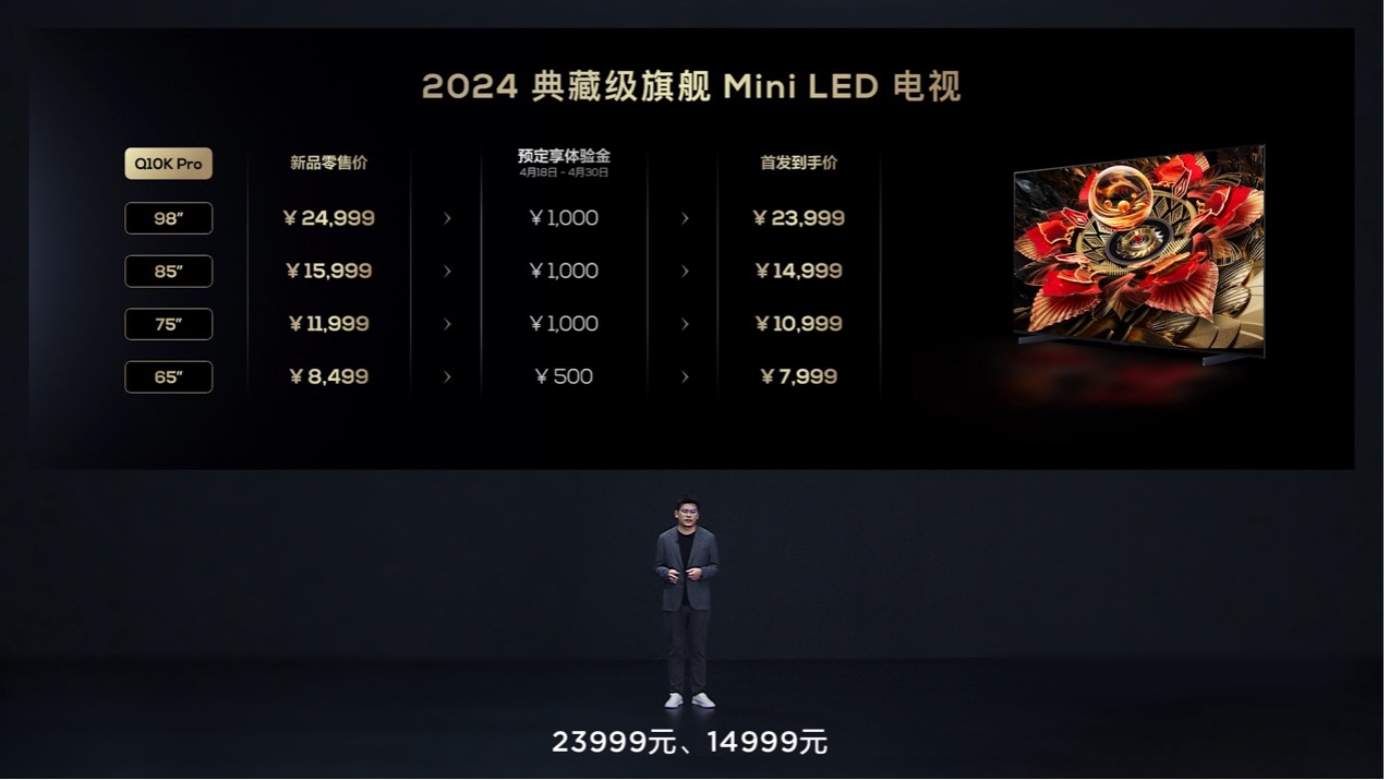 Q10K Pro全系共4个尺寸,分别是98吋、85吋、75吋和65吋,预售期间,98到65吋返体验金后到手价分别是:23999元、14999元、10999元、7999元。目前Q10K和Q10K Pro都已经开启全网预售,并在4月30日晚8点正式开售!