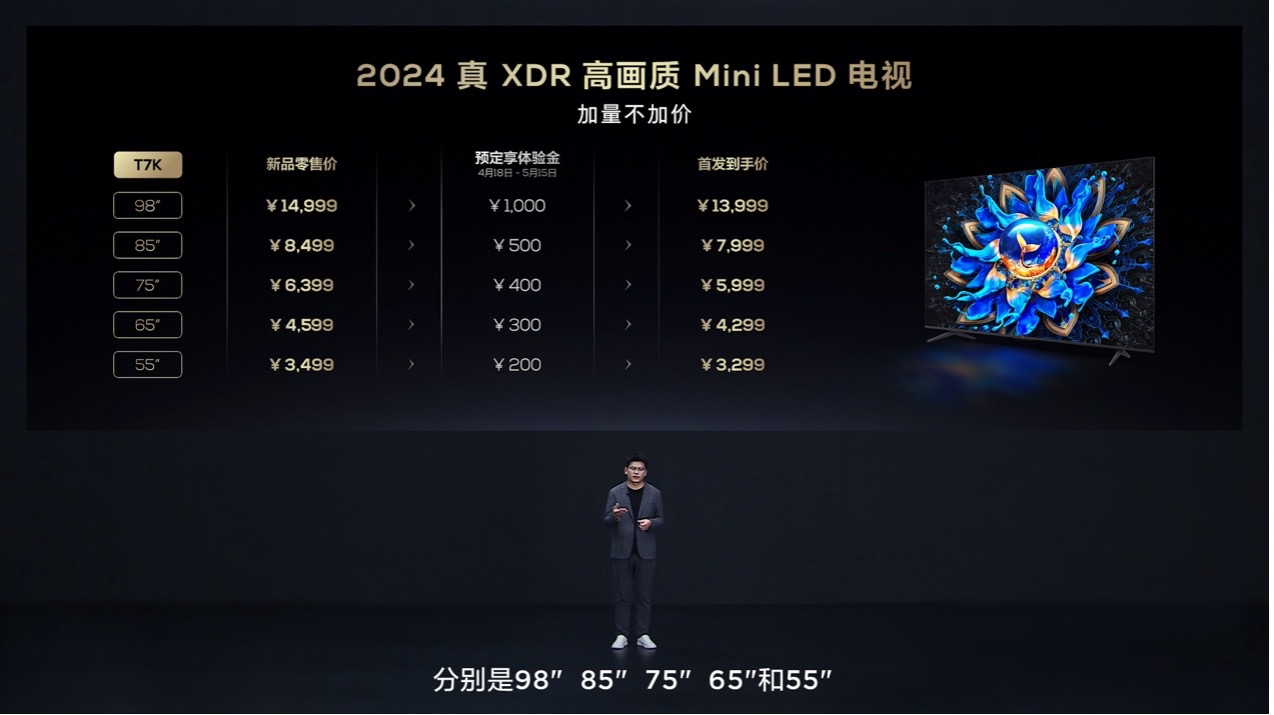T7K 拥有98、85、75、65、55吋共五个尺寸,预售期间返体验金后,98吋到55吋实际到手价分别是:13999元、7999元、5999元、4299元和3299元,质价比极高,将于5月15日晚8点正式开售!