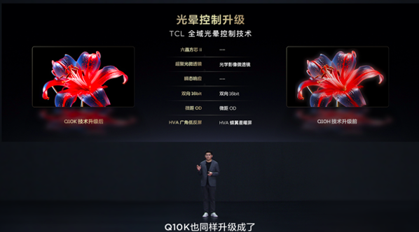 Q10K还升级了全域光晕控制技术,这一步是打造优秀Mini LED电视的关键,直接关系到用户体验。控光技术是检验Mini LED电视优秀与否的关键,在传统Mini LED技术中,光线无法有效收敛,容易溢出分区范围,从而产生光晕现象——即电视图像边缘出现的模糊虚影,这会极大地影响观众的观看体验。TCL Q10K Mini LED电视通过六晶方芯Ⅱ、超聚光微透镜、HVA广角低反屏等先进技术升级迭代,有效解决了光晕干扰问题,确保画质更纯净和真实。可以看到,发布会展示的照片中,升级后的花朵色彩较升级前更加生动、色彩明艳。