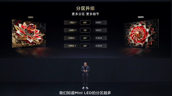 分区升级,是画质提升的关键。新一代Q10K在65、75和98英寸产品中体现出更多分区,如65英寸分区数量从1080提升到1512,75英寸从1920提升到2160、98英寸从2304提升到2592。分区越多,精细控光的能力会更强,呈现的画面细节也会更丰富、逼真。从发布会现场演示的对比照片中可以看到,升级分区后Q10K的画质明显比上一代更加灵动,色彩更加细腻丰富,尤其是屏幕边界附近的素材能呈现更多色彩,仿佛有额外光源打在上边,产生类似天然补光的视觉效果,使屏幕中画面看上去更多维立体。