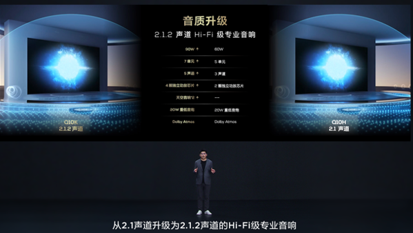 享受视觉盛宴的同时,不妨来一场耳朵“按摩”。Q10K全新升级了Hi-Fi级专业音响,从2.1声道升级为2.1.2声道,音响单元由5单元升级成7单元,声道从3声道升级成5声道,功率方面从60W升级到90W,还新增了2个天空声道。声音经过天花板的反射,可以听到从天而来的声音,搭配Dolby Atmos的技术,能感受到360°全方位3D立体环绕的声场效果。比如影片里一架飞机从头顶飞过,你甚至能听到螺旋桨在头顶盘旋的呼啸声,音响效果极其震撼。