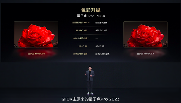 说到色彩,基于最新的量子点Pro 2024显示技术,Q10K能够实现98%的DCI-P3色域覆盖,色彩表现更加精准、自然。此外,四元量子晶体升级成四元量子晶体Pro,拥有95%全屏色纯度,色彩技术的提升,使得Q10K在显示各种场景时,能够还原出真实世界的色彩,进一步提升用户观看体验,主打一个真实。
