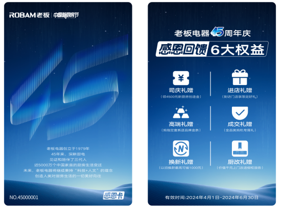 今年的政府工作报告指出,从优化供给等方面综合施策,激发消费潜能。老板电器作为行业领军者,积极响应国家号召。正值老板电器成立45周年之际,为了让更多消费者感受数字烹饪的科技,也为了提振市场信心,老板电器在一年一度的“中国新厨房节”上,重磅推出周年庆感恩行动,为消费者带来十大服务承诺五大超值服务,推动周年庆安检进万家行动,更有六大重磅权益为消费者送上亿元补贴,推动数字厨电智能科技走进千家万户,打造属于用户的“厨房造物节”。