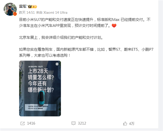 雷军在回应中,首先承认了小米本身产能不足的问题但也提到到正在提升。而后又给已经下定的小米用户吃了颗“定心丸”,表示将在北京车展上谈交付。最后雷军还不忘推荐其他国产新能源品牌车辆,其中也包括智界。