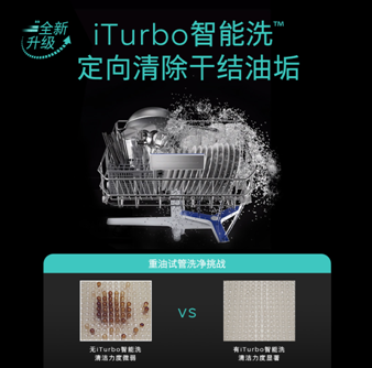 以全能派代表西门子全能舱Pro洗碗机为例,全新搭载iTurbo智能洗技术,与原有的精准涡流洗相配合,实现在不额外消耗水量的前提下集中4倍水流在某一特定区域持续冲刷,水流密度可增加58%,强效去除顽固污渍,实现全域洁净。