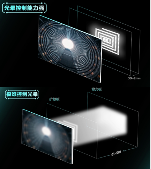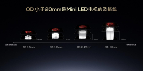 OD值,指背光板到扩散板之间的距离。OD值越小,发光面越聚焦,与规划分区大小越匹配,光晕控制能力也就越强,画质表现也就更优秀,同时电视整机可以做得更薄。业内公认OD值小于20mm是Mini LED电视的及格线,当OD值小于20mm时才能较好地控制光晕。