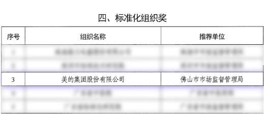 近日,广东省人力资源和社会保障厅和广东省市场监督管理局联合印发了《关于表彰广东省标准化突出贡献奖获奖项目、单位和个人的决定》(粤人社发[2024]9号),美的集团荣获广东省标准化突出贡献奖。