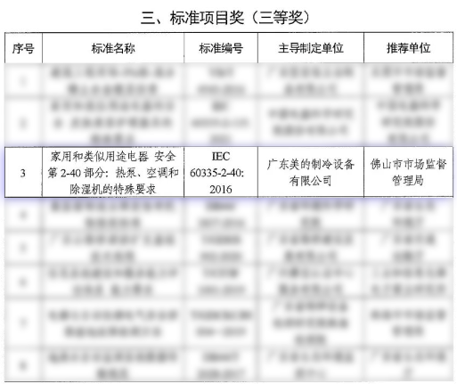 此外,由美的集团家用空调主导的IEC 60335-2-40:2016《家用和类似用途电器的安全 第2-40部分:热泵、空调和除湿机的特殊要求》获标准项目奖三等奖。